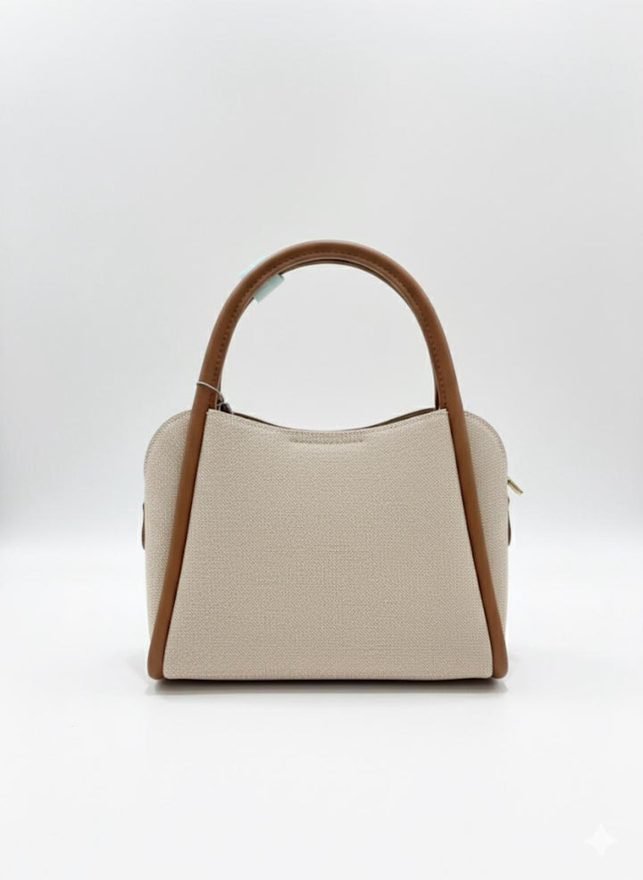 A timeless beige and brown structured tote handbag with premium textured finish and dual top handles.