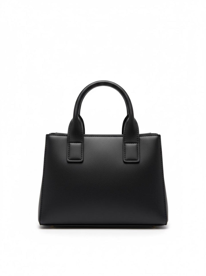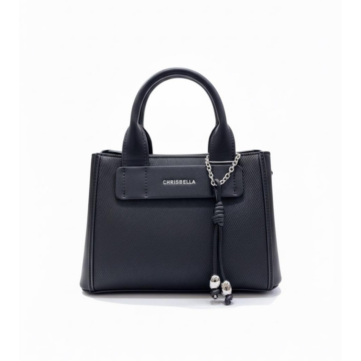 A sleek and versatile black structured handbag featuring a modern design with textured finish, sturdy dual handles, and a chic silver chain tassel detail.
